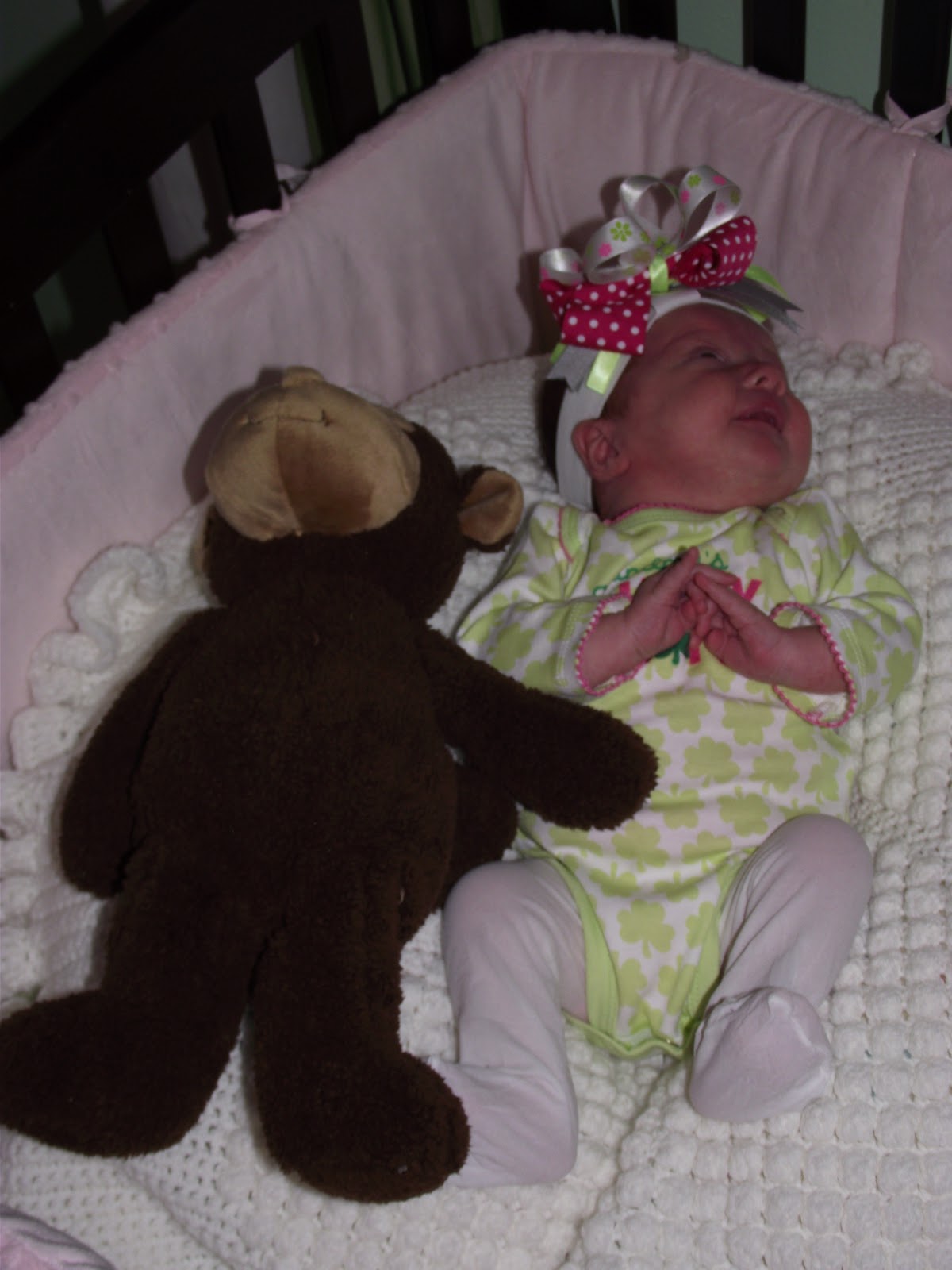 Size: You are 8 lbs 3 ounces now, and 20 1/2 inches. You have grown so much in the last two weeks and I am so proud of you. Just for my memory you dropped to 6 lbs the week after birth, then you weighed 6 lbs 5 ounces, then 6 13.5 by 2 1/2 weeks and now at four weeks you weigh 8 lbs 3 ounces. You are still wearing newborn clothing, and you are filling them out now. Your onsies are starting to get a little short on you. You can wear some 0-3 but it is still a little roomy. Your feet are as tiny as Caleb's were and no socks will stay on you. You are wearing size newborn diapers.
